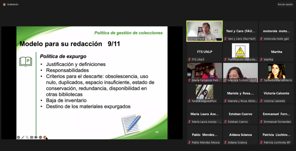Curso Redacción de Políticas para la gestión de colecciones bibliotecarias. Dictado durante los meses de septiembre y octubre, fueron 4 clases virtuales todos los miércoles de 9 a 12 horas (12 horas en total). Se desarrolló a través de un espacio en el campus virtual de la UNLP (Aulas Formación), con clases sincrónicas dictadas por Zoom reservado a través de la Prosecretaría de Capacitación Nodocente. La docente a cargo fue la Mag. Mónica Pené, ex-directora del área de Gestión de Colecciones de BIBHUMA y ex-profesora titular de la cátedra Gestión de Colecciones de la FaHCE-UNLP y reconocida profesional de la disciplina en el tema, quien generosamente donó su tiempo y trabajo para brindar esta capacitación. Total de participantes: 52 (actualmente en evaluación).
